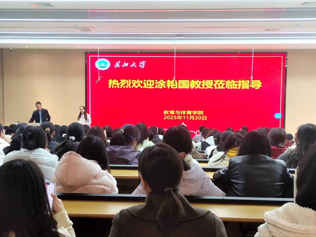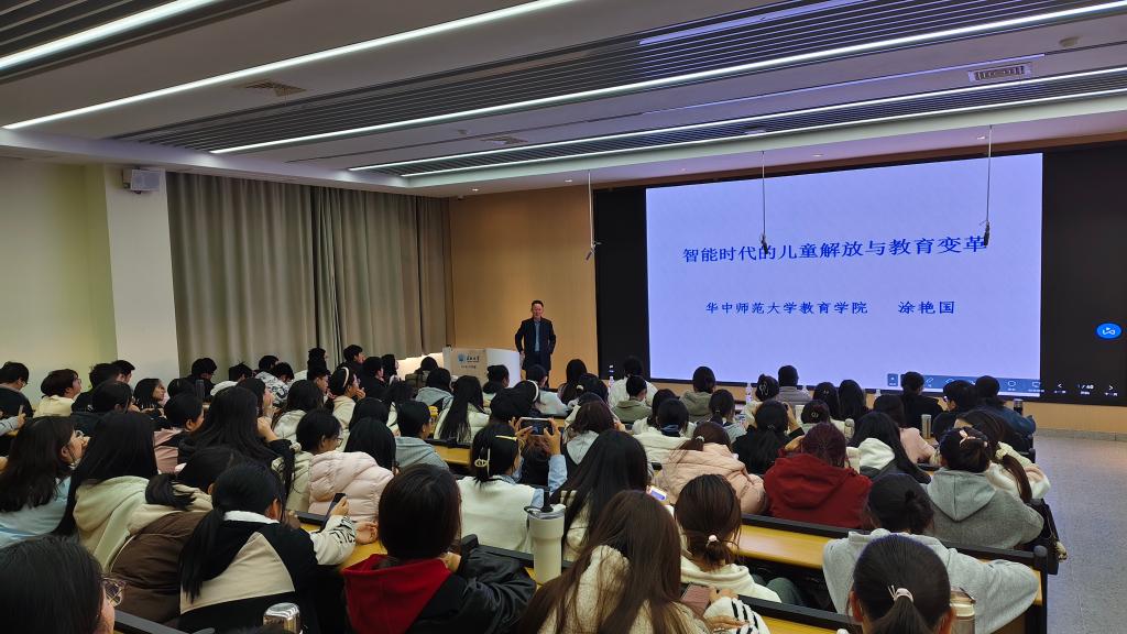 (通讯员 刘琦)2025年11月20日14:00,16教A109智慧教室座无虚席,一场以“智能时代教育新生态”为主题的精彩讲座如期举行。华中师范大学教育公司涂艳国教授担任主讲人,其中“儿童解放与教育变革”是本次讲座的核心议题。报告会由太阳集团tyc151cc经理张艳红主持,教育学专业本科生、研究生及教育系全体教师共计160余人聆听报告。