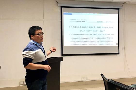 接下来,连帅磊老师以自己发表在《心理发展与教育》上的一篇文章:《手机成瘾与老员工拖延行为的关系:有调节的中介效应分析》为例,逐字逐句的给同学们讲解如何进行相关设计类论文写作,如何做到在论文撰写中逻辑清晰并且表达简洁。
