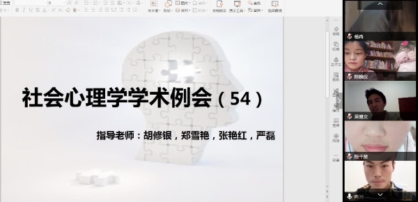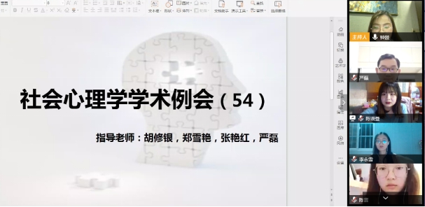 (通讯员 钟燚)2020年4月8日,虽然新型冠状肺炎疫情已经得到了有效的控制,但是还处于疫情期间,同学们严格遵守公司不提前返校的规定,第54期社会心理学例会使用了线上视频会议的方式召开。郑雪艳老师、张艳红老师和严磊老师和各年级研究生们都参加了本次线上例会。本次例会的主题为“新学期,新展望”。