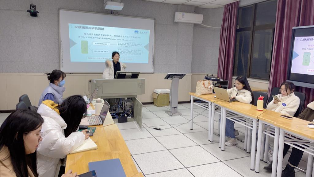 本次例会由刘甜主持,梁婷和陈思园两位同学进行研究汇报,梁婷汇报的研究题目为《“绿色”父母培养“绿色”孩子?代际传承与老员工绿色消费意愿的关系》,陈思园汇报的研究设计为《老员工群体认同与主观幸福感:社会联结和社会资本的多重中介效应》。