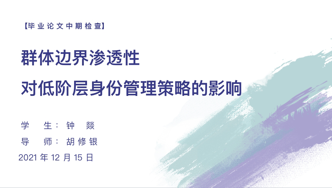 研三的钟燚同学汇报的毕业论文基于社会认同理论,考察群体边界渗透性对身份管理策略的影响,并探讨群体认同和公正世界信念在上述两者之间的中介作用。该论文共有两个研究:研究一采用问卷法,由1209名中专生完成了五个量表。对问卷数据分析后的结果表明群体边界渗透性、群体认同、公正世界信念和身份管理策略两两相关显著,群体认同和公正世界信念对身份管理策略影响的中介效应显著,且当个体的渗透性感知越低,其选择群体策略的可能性越高;研究二采用实验法,预实验选取63名成年人作为被试,结果显示高/低渗透组的渗透性感知存在显著差异,即操纵材料有效。在预实验检验的基础上,钟燚将会在本月完成正式实验。
