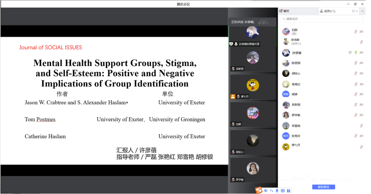 (通讯员:刘甜)2022年3月28日晚19点至21点,第105期社会心理学学术例会在线上举行。参加例会的有郑雪艳老师和张艳红老师,以及10名心理学研究生。本次例会由研二张浩毅同学主持,研一许彦蓓同学进行文献汇报,汇报文献为《Mental Health Support Groups, Stigma, and Self-Esteem: Positive and Negative Implications of Group Identification》。