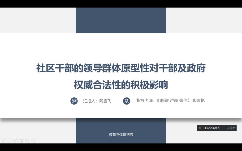 (通讯员:许彦蓓)2022年5月6日晚19点至21点,第110期社会心理学学术例会在腾讯会议线上举行。出席本次例会的有严磊老师,以及9名心理学研究生和7名本科生。本次例会由胡汇鑫同学主持,研二陶雪飞同学进行开题设计汇报,主题是《社区干部的领导群体原型性对干部及政府权威合法性的积极影响》。