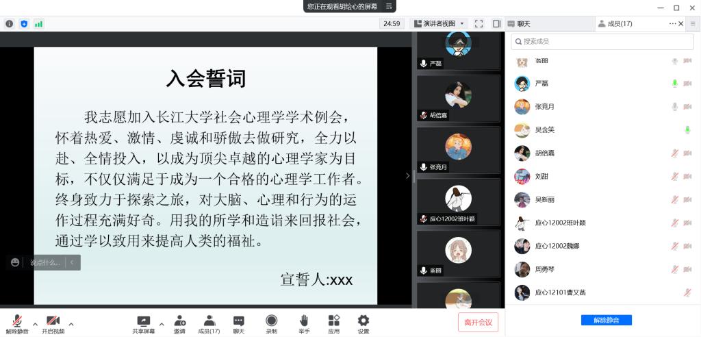 一开始,主持人告诉了大家一个好消息,张老师已经平安抵达美国即将开始访学之旅,并呼吁大家在学术上以张老师、严老师为榜样,以“成为顶尖卓越的心理学家为目标”而全力以赴,在实践中学习郑老师“用所学和造诣来回报社会”的精神,学以致用帮助需要心理帮助的人。