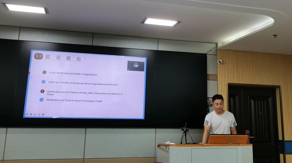 龚锰同学从选题、结构、结果、阅读与思考四个方面对文献进行了汇报。他首先从题目关键概念入手,对元分析、社会认同、心理健康进行概念阐述,并指出社会认同与心理健康的研究关系;其次,针对文章的研究假设和现状分析,引出本文使用元分析的研究方法与过程;最后,解释本文的研究结果,得出组织中的社会认同是影响个人健康的支柱。