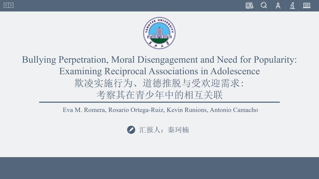 紧接着,秦珂楠同学汇报了于2021年发表在《Journal of Youth and Adolescence》杂志上的文章《Bullying Perpetration, Moral Disengagement and Need for Popularity: Examining Reciprocal Associations in Adolescence》。秦珂楠同学在文献汇报之前先向各位同学系统介绍了该篇文章涉及到的知识点——测量等值、传统交叉滞后模型以及随机截距交叉滞后模型。该研究考察欺凌实施行为、道德推脱与受欢迎需求在青少年中的相互关联,采用了西班牙版欧洲欺凌干预项目问(EBIPQ)的子量表、西班牙版青少年道德推脱量表以及受欢迎量表进行研究,并通过初步分析、传统交叉滞后面板分析、随机截距交叉滞后面板分析以及敏感性分析得出本研究的实验结果:随时间的推移,欺凌实施行为和道德推脱没有表现出双向关联;在个体间和个体内水平上,受欢迎需求均可正向预测随后的欺凌实施行为;在个体间和个体内水平上,受欢迎需求也可预测道德推脱随时间推移的增加。研究结果强调了欺凌行为背后的动机和道德机制之间的相互作用。
