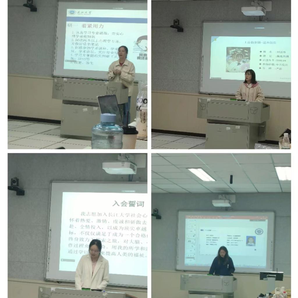 首先是五名研一同学从学习、实践、爱好等多个方面展示了自己丰富多彩的经历,他们也制定了清晰的新学期学习计划,其次是研二同学从实习工作、论文进展、学术阅读和课外生活等多个方面回顾了自己的暑假,同时,他们也针对自己的阶段性任务规划了新学期的时间安排。紧接着,本科生科研助理汇报了自己在暑假的科研进展与生活感悟,他们在劳逸结合中学习专业知识、寻找自己的专业志趣。此外,首次参加社心例会的4名大三心理学本科生也做了自我介绍,在场的老师们希望他们能够坚持参加例会,促进自己的专业学习。同学们汇报结束后,严老师介绍了《太阳集团tyc151cc社会心理研究中心的员工指导理念》,严老师从中心简介、员工学业规划、员工指导理念等三个方面对研究生的3年学习提出了总体规划。