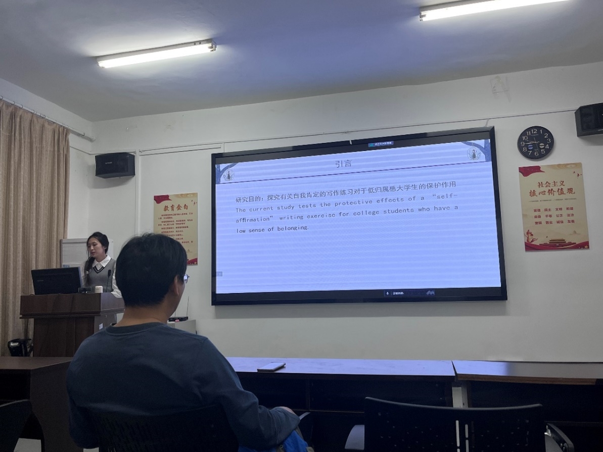 紧接着,陶燕林同学汇报了于2019年发表在《Journal of Experimental Social Psychology》杂志上的文章《Bolstering trust and reducing discipline incidents at a diverse middle school: How self-affirmation affects behavioral conduct during the transition to adolescence》。该文章逻辑思路清晰,探究自我肯定如何影响青少年过渡时期的行为。陶燕林同学从引言、方法、结果、讨论四个方面进行汇报,对文章中出现的概念、使用的方法进行讲解,特别介绍了多层嵌套模型,带领大家学习。汇报结束后,陶燕林同学提出了自己的疑惑,老师们帮助理解和解答。汪瑛倩学姐结合自己的实习,将实习经验代入到文献中,希望能够找到解决实际生活的方法。随后,朱老师对文章进行了点评,甘雄老师认为文章中的内容是值得我们学习的,朱老师就PPT制作和汇报本身对同学提出建议,认为数据中的字体应当规范。最后,连帅磊老师认为语速应该放慢,不然对于难点的方法,同学们会听不懂。并提出了今后学习的方法。