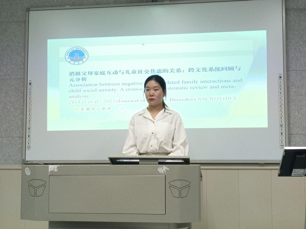 首先,张泽同学进行了一项以元分析为主题的英文文献汇报,题目为《Association between negative parent-related family interactions andsocial anxiety:A cross-cultural systematic reviewand meta-analysis》。该研究旨在探讨消极的家庭互动对孩子社交焦虑的影响,并通过对多个独立研究进行综合分析,采用元分析的方法来总结和验证现有研究的结果。在汇报中,张泽同学介绍了研究的背景和目的,并详细说明了文献筛选的过程、研究标准和结果的统计分析方法。她还提供了一些关键的发现和结论,例如,消极的家庭互动与社交焦虑存在显著的正相关关系。随后,朱老师为大家详细介绍了元分析的概念、意义和重要性,解释了为什么采用元分析方法对该主题进行研究。