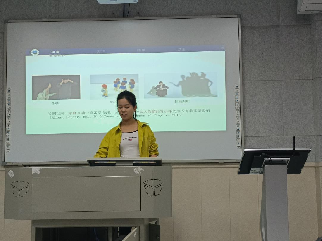 接着由胡双双同学汇报《Family incivility and cyberbullying in adolescence: A moderated mediation model》,在汇报中,胡同学首先介绍了研究的背景和目的,即探索家庭不和与青少年遭受网络欺凌之间的关系,并提出了一个调节中介模型。随后,胡同学详细解释了研究的设计、数据收集方法以及分析方法。他还介绍了研究结果,并讨论了调节作用和中介效应的相关发现。随后,朱老师和周老师对胡同学的汇报提供了指导性意见,并围绕心理学学术语言表达向大家提出了讨论,使同学们受益良多。
