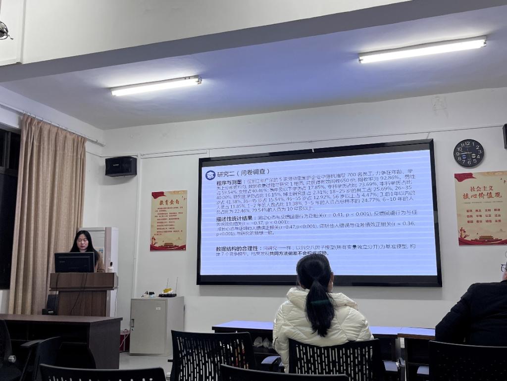 紧接着,曹云诺同学汇报了于2023年发表在心理学报上的文章《命运天定还是逆天改命:探索劣势者成见的“傀儡效应”与“黑马效应”》。该文章逻辑思路清晰。曹云诺同学从引言、方法、结果、讨论四个方面进行汇报,提出特质激活理论,对文章中出现的概念、提出的实验研究进行讲解,带领大家学习。汇报结束后,曹云诺同学提出了自了理论启示以及实践启示。汪瑛倩同学结合自己的经验,提问曹云诺同学该文献中给我们提出的研究视角有哪些,随后,甘老师对文章进行了点评,甘老师认为文章缺少了一定的创新之处,对研究二提出了质疑,周婷老师随后也进行了点评,认为研究一可能是起到预设作用。最后,甘老师认为曹云诺同学汇报文献中的内容非常全面。