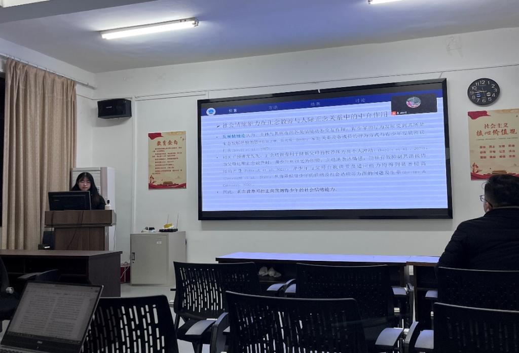 首先,黄贝同学给我们分享了预答辩的整个过程,文章的题目是《父母正念教养与青少年人际正念的关系:有调节的中介模型》,黄贝同学从4个方面进行汇报。首先进行引言部分,理论基础为家庭系统理论、社会情绪能力理论。紧接着进入研究方法,黄贝同学进行了三个实验研究,其中在研究三中进行性别差异的模型检验。在汇报尾声,提出自己的收获和思考。汇报过后,黄贝同学对自己的毕业论文进程进行了概括,文章还需要进一步的反复查看。甘雄老师对黄贝同学指出超时的不足之处,接着他认为在测量时不能使用同一批数据。曹晓萱同学认为在路径系数图中效度没有进行汇报。最后,各位老师对文章进行讨论,甘雄老师、周婷老师总结该篇文章,认为应该将不足之处细心落实。