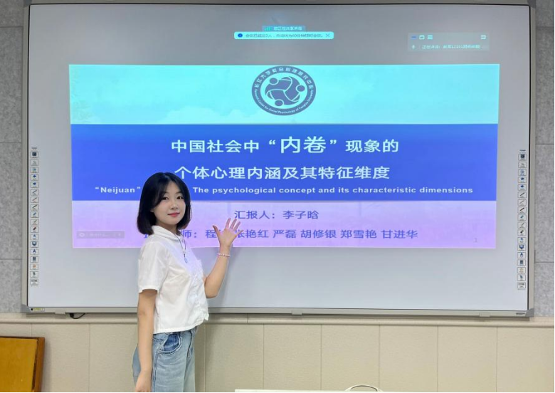 最后,李子晗同学从研究背景、研究设计、讨论、不足与展望等部分展开汇报。随着中国社会的高速经济发展与快速社会转型,研究者们开始关注不断变化的社会文化对个体心理产生的影响。与此同时,“内卷”一词也引发了全民的关注与讨论。因此,该文献基于扎根理论,首次以文化心理学作为研究视角,采用访谈法与问卷法对内卷的心理内涵、特征维度及其测量工具进行探索。该研究的发现不仅填补了中国社会下内卷现象的理论基础空白,还有助于未来探究内卷对个体心理以及社会性发展的影响机制。