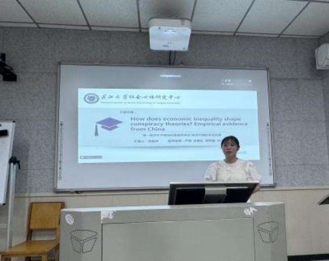 接着,刘嘉玲同学从研究背景、方法结果、研究讨论等方面展开文献汇报。在经济高度不平等的社会中,阴谋论往往很普遍。虽已有西方学者探究了经济不平等与信仰阴谋论之间的关系,但结果不一定适用于中国社会。近些年,中国社会的经济不平等尤为突出,有必要在中国背景下重新探讨上述两者之间的关系。因此本研究基于四个实验揭示了经济不平等与信仰阴谋论之间的关系及其心理机制。该研究结果表明经济不平等对信仰阴谋论的影响不仅发生在不同的文化中,还发生在经济发展水平不同的社会中。