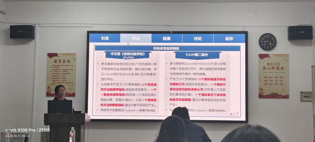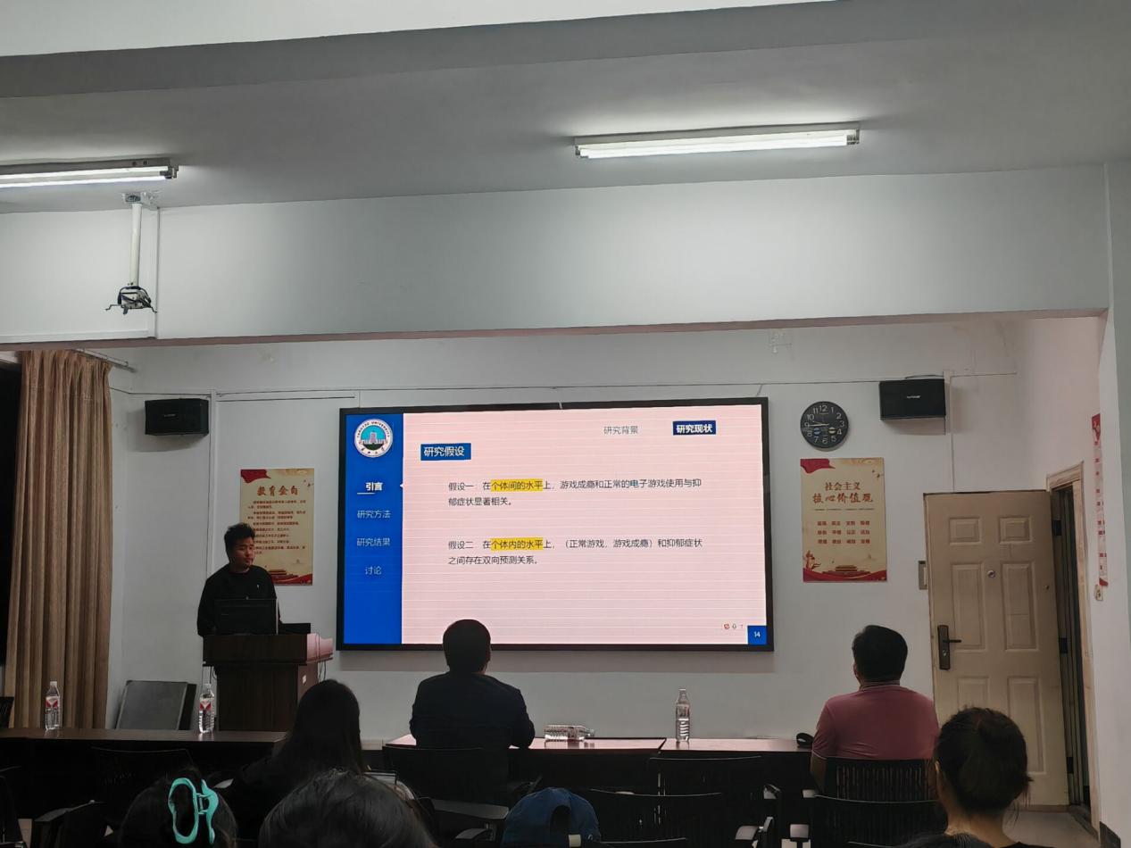 2024年10月11日晚7点整,本学期青少年网络心理与行为第五期例会在教5教203正式开始,连帅磊老师、甘雄老师参加了本次例会,朱晓伟老师和周婷老师因事并未参加本次例会,还有部分研究生和部分本科生也参与了本次例会中,会议氛围十分温馨。 本次例会我们有幸听取了两位同学的精彩汇报。首先,王佳祥同学分享了一篇2024年发表在《Journal of Youth and Adolescence》上的文章,题为《Longitudinal Dynamic Relationships Between Videogame Use and Symptoms of Gaming Disorder and Depression Among Chinese Children and Adolescents》。该研究通过六次的纵向设计,探讨了中国青少年和儿童网络成瘾与抑郁之间的纵向关系。汇报后,连帅磊老师和甘雄老师对该文章的统计方法进行了深入浅出的讲解。并且连帅磊老师对于具体的纵向研究方法进行了更加深刻的讲解,并且对同学们提出了数据方法学习的要求。 接下来,夏领域同学汇报了一篇2024年发表在《Journal of Youth and Adolescence》上的文章《Quantifying the Importance of Non-Suicidal Self-Injury Characteristics in Predicting Different Clinical Outcomes: Using Random Forest Model》。该研究通过建立随机森林模型预测不同临床结果中非自杀性自伤特征,并且对于非自杀性的自伤特征的量化也进行了更加深入的研究,:甘雄老师和连帅磊老师再次对其汇报进行了高度的评价,并鼓励大家从每周的汇报中学习新知识,寻找新方法,开拓新领域。 到此,本期例会圆满结束,相信大家都收获满满,让我们一起期待下周的文献汇报吧!
