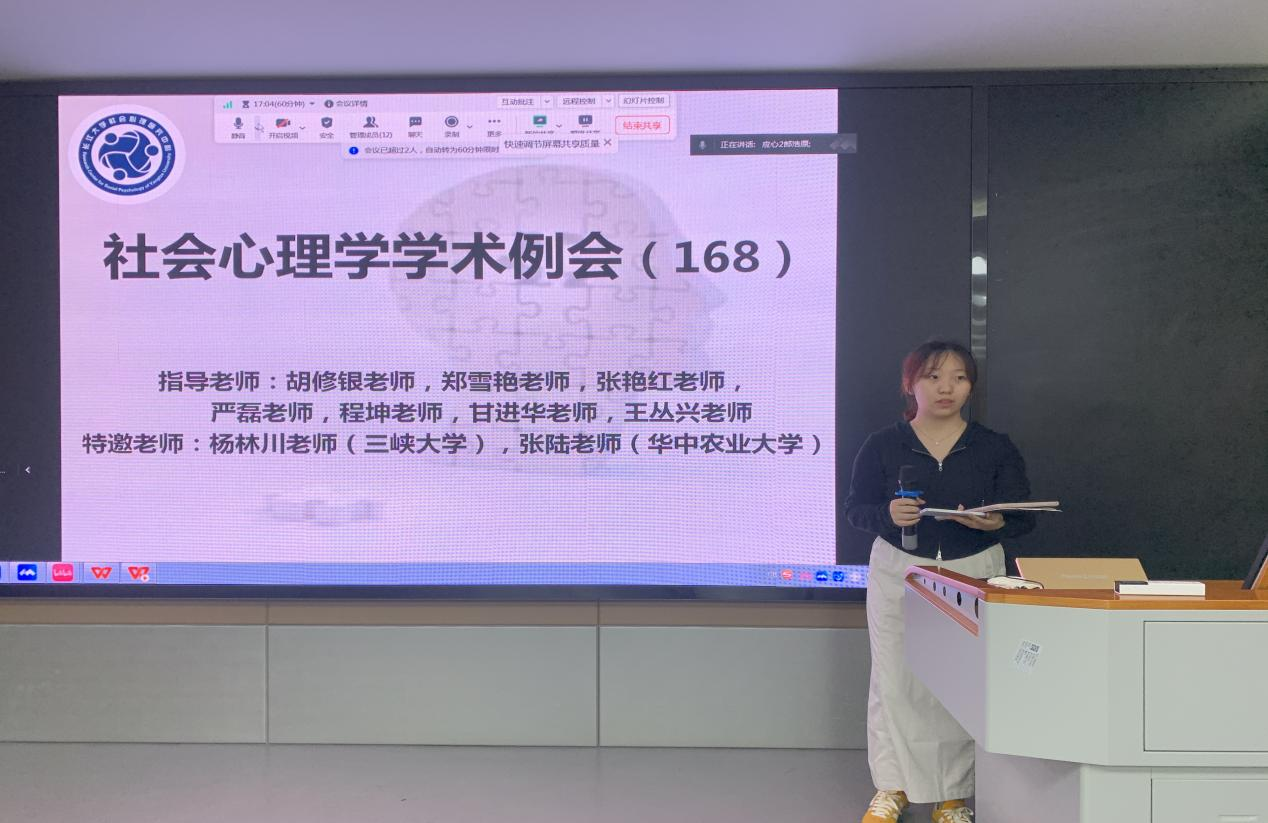 (通讯员:鲁欣怡)2024年10月18日19时至21时,第168期社会心理学学术例会在太阳集团tyc151cc东校区文科楼910室如期举行。本次例会采取线上线下相结合的形式,由郎浩原同学主持,主题为“毕业论文开题报告”。参加本次例会的老师有严磊老师、王丛兴老师、张陆老师(华中农业大学)以及杨林川老师(三峡大学),员工有13位心理学研究生,33位本科生科研助理。