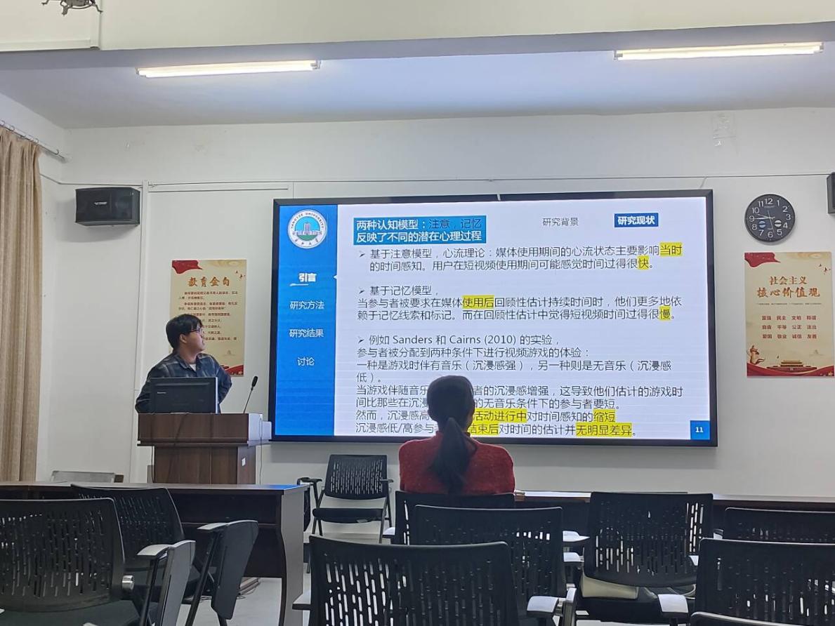 2024年11月01日晚7点整,本学期青少年网络心理与行为第七期例会在五教203正式开始,连帅磊老师、朱晓伟老师、甘雄老师、周婷老师参加了本次例会,还有部分研究生和部分本科生也参与了本次例会中,会议现场气氛非常热烈。 本次例会我们有幸听取了两位同学的精彩汇报。首先,饶仕杰同学分享了一篇发表在《Computer in Human Behavior》上的文章,题为《Time distortion for short-form video users》。该研究的研究方法是实验法。汇报结束后,朱晓伟老师认为在PPT的呈现方面需要精简,多余的语句可以删掉,在表达方面也有很多进步的空间。周婷老师认为有很多东西不需要汇报出来,这样可以节省时间与精力;除此之外,在将英文翻译成中文时应该翻译准确,避免在汇报时产生歧义。 其次,张绍杰同学分享了一篇2024年9月24日发表在《Computer in Human Behavior》上的文章,题为《Adverse Childhood Experiences and Short-Form Video Addiction: A Serial Mediation Model of Resilience and Life Satisfaction》。该研究使用连续和分类累积风险模型探讨了短视频成瘾与四种不良童年经历以及 0 至 7+ 范围内的不良童年经历数量之间的剂量反应关系,除此之外,也探讨了不良童年经历和短视频成瘾的内部机制:心理韧性和生活满意度起着序列中介作用。汇报结束后,周婷老师认为汇报的时间过长,应该严格把控汇报时间。而且认为汇报的文献需要有值得大家学习探讨的创新点,不要汇报太过于简单的研究。 到此,本期例会圆满结束,相信大家都收获满满,让我们一起期待下周的文献汇报吧!