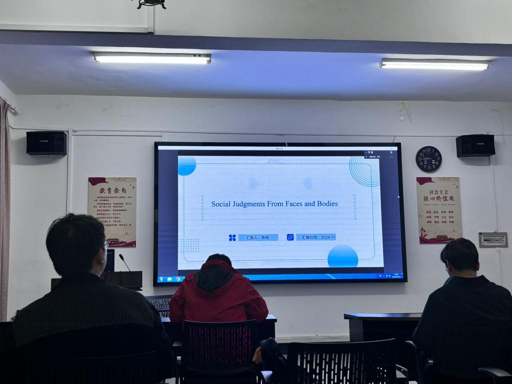 2024年11月22日晚7点整,本学期青少年网络心理与行为第十期例会在五教203正式开始,连帅磊老师、朱晓伟老师、甘雄老师、周婷老师参加了本次例会,还有部分研究生和部分本科生也参与了本次例会,会议现场气氛非常热烈。 本次例会我们有幸听取了两位同学的精彩汇报。首先,郭靓同学进行了文献汇报。主要探讨了从面部表情的社会判断。这告诉了我们在现实生活中我们要合理的运用好自身的身体和面部表情并且这个研究也提出了要多用眼动,脑电实验来探究行为。 其次,曹晓萱同学进行了毕业论文进展汇报。该研究主要进行了正念教养的研究,内容详实并且进行了多方面,多维度的分析从量表的编制到行为实验,从多维度研究了正念教养与网络成瘾的关系。汇报结束后,连帅磊老师建议研究生应该不断精进自己的毕业论文水平,并且在汇报论文和进行毕业论文的写作时注意研究方法和研究工具的使用,不要光以数据为导向,要在理论基础扎实的情况下合理的汇报数据。不要进行数据的堆砌。 到此,本期例会圆满结束,相信大家都收获满满,让我们一起期待下周的文献汇报吧!
