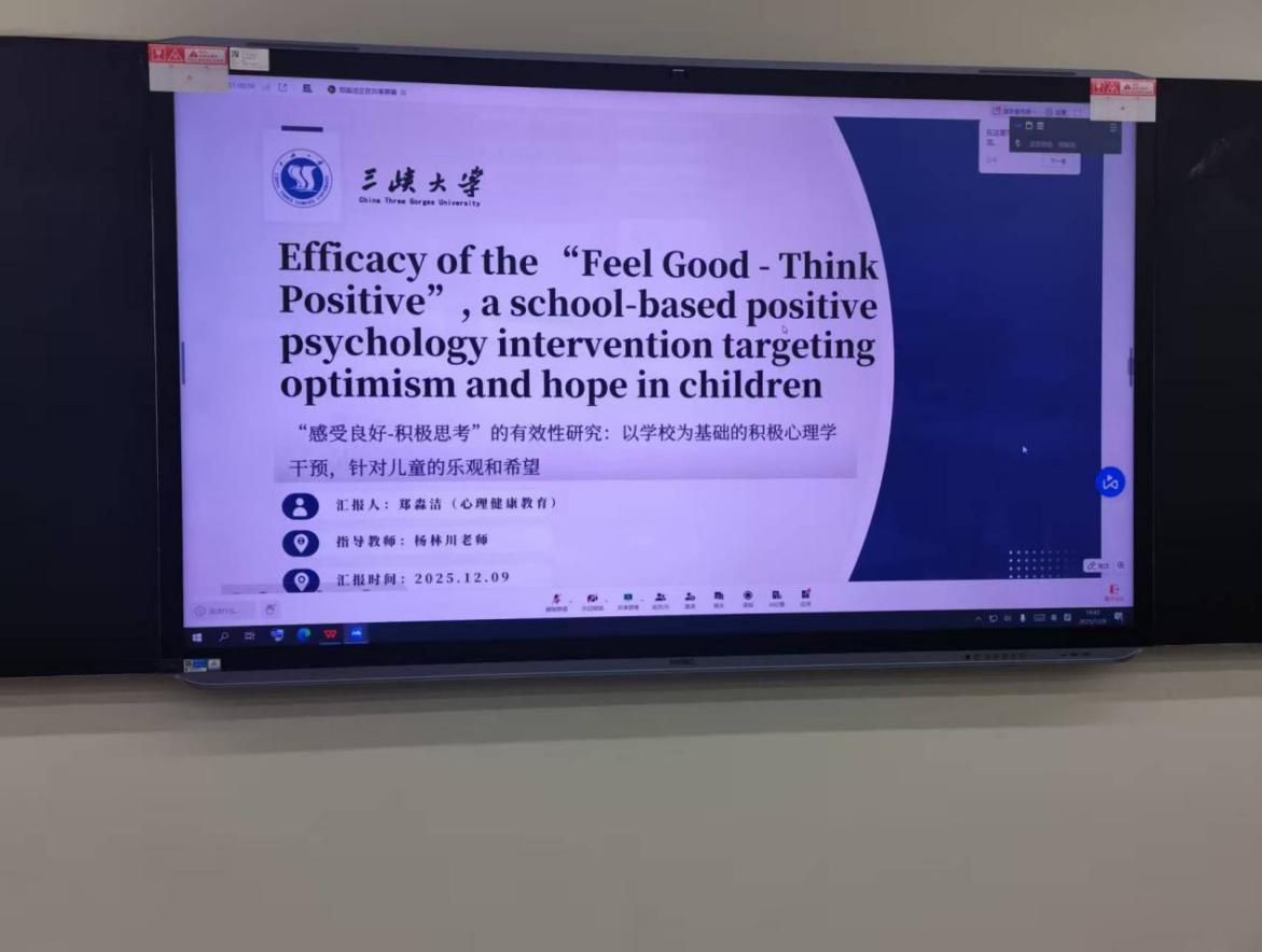 其次,郑淼洁同学进行了文献分享汇报,其汇报题目为《“感受良好-积极思考”的有效性研究:以公司为基础的积极心理学干预,针对儿童的乐观和希望》。