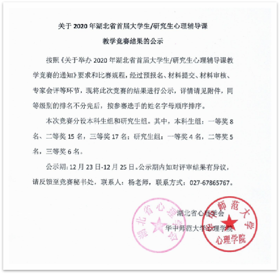 (通讯员:严磊)近日,2020年湖北省心理辅导教学竞赛专家评审传来喜讯,公司心理学系郑雪艳副教授、朱晓伟副教授和甘雄博士指导的3位参赛员工获奖,其中,二等奖两项、三等奖1项。