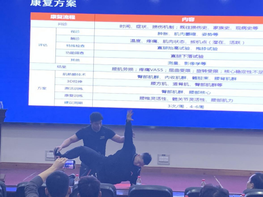 会议伊始,陈泳龙总监首先针对什么是运动康复进行了介绍。随后又围绕当前康复核心技能、运动康复流程、常见康复干预手段以及腰痛干预手段等六个方面进行了详细讲解。整场报告与社会实际相结合,理论解读和案例展示相配合,通过“手枪试验”、颈部放松以及托马斯测试等现场互动,切实讲解了运动康复在实际生活中的运用问题,为体育专业员工开辟了新的思路。