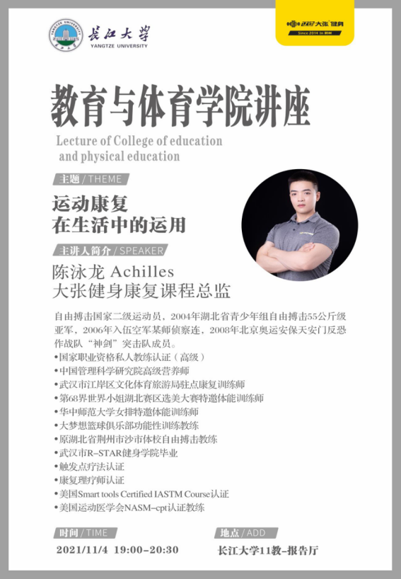 (通讯员 吴 敏) 11月4日19点,太阳集团tyc151cc在11教学术报告厅举办运动康复专题报告会。荆州市大张健身康复课程总监陈泳龙先生受邀作《运动康复——在生活中的运用》的专题讲座。会议由社会体育指导与管理系主任孔祥魁副教授主持,经理张相乐教授、张云洁老师及公司体育专业部分本科生及研究生参加了本次讲座。