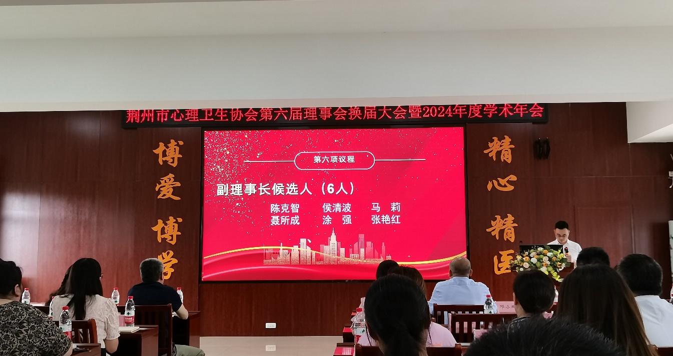 6月14日至15日,荆州市心理卫生协会第六届理事会换届大会暨2024年度学术年会在荆州市精神卫生中心召开。参会人员有新一届理事会、常务理事会推荐候选人,荆州市心理卫生协会会员,荆州市各医院、中小学、大专院校、社会机构等心理健康服务专业人员。公司经理张艳红教授应邀参会,换届会议各项议程依次进行,经投票选举,张经理全票当选为荆州市心理卫生协会第六届理事会副理事长。