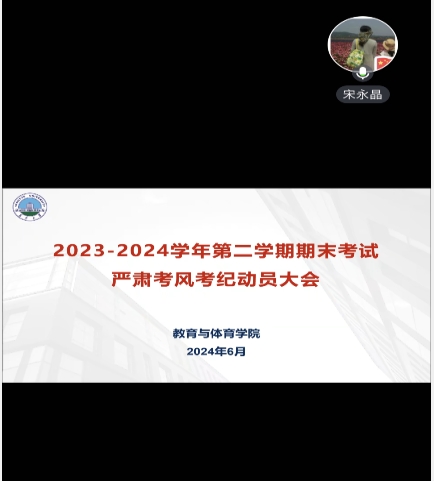 为端正考风,严肃考纪,确保公司本学期期末考试的顺利进行和公平公正,公司于6月21日上午10:30分线上召开严肃考风考纪动员大会,宋永晶副经理主持会议,全体监考教师参会。