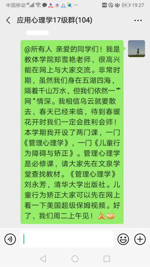 在教学过程中郑老师不仅注重员工对理论知识的掌握,更是充分发挥了课堂思政的作用,同时也对处于特殊时期的员工及时运用专业知识进行心理疏导。在网络教学过程中,郑老师要求同学们在听课前准备好笔和笔记本,坐在电脑前或者拿出手机放在桌上听课,这样便于集中注意力。促进同学们养成良好的学习习惯,在《儿童行为矫正》课中,鼓励同学们运用学到的知识点,对自己的良好行为进行强化,鼓励同学们运用专业知识帮助自己、家人和朋友。在授课过程中,有些同学有些焦虑、恐惧、悲伤等情绪,问到什么时候可以回公司,有些同学在家里呆久了烦躁无聊,有些同学每天过度关注疫情信息,甚至导致了替代性创伤,郑老师在课堂教学中结合案例,运用心理学知识安抚同学们情绪,帮助同学们客观分析各种信息,学会接纳,学会反思,学会沟通。让每个同学问问自己,“我在这场防疫战斗中,我的专业能为防控做点什么?”“我能做出什么贡献?”。