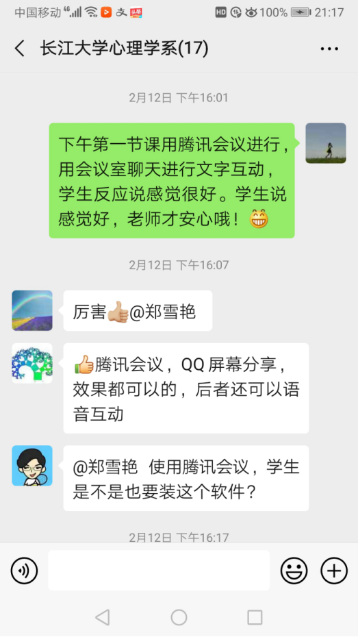 面对新的教学形式,虽然做了很多的准备,但老师们心里还是有些许忐忑,公司和系部领导非常重视老师们的诉求,要求各系部成立课程小组,根据教务处通知要求制定网络教学基本规范,系主任带领老师们讨论网络教学中可能遇到的困难和问题,商量解决的办法和措施。为了保证教学效果,郑老师虽然做了充分的准备,但郑老师仍然担心出现意想不到的故障,她把自己的担忧与公司和系部的领导及老师进行交流,同事们一边鼓励她,一边把自己授课的经验,自己在家里存储的资料与她分享,公司领导多次关心自己的健康和教学,这些都给了郑老师无尽的温暖和鼓励。每次课程结束后她都会与远方的同事们讨论哪些授课软件的效果好,讨论其他的同事们在授课中有什么好的经验和做法,让同事们帮忙在家寻找网上查不到的教材内容和资料。在这个暖心的团队里,郑雪艳老师感受到了集体的力量和温暖。