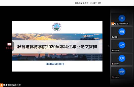 2020年5月30日上午八点整,公司2020届体育类本科生毕业论文线上答辩工作通过“腾讯会议”平台正式开始。参加本次毕业论文答辩共有来自体育专业的212名同学,答辩共分为12个小组。每个小组一名组长,一名研究生担任秘书。