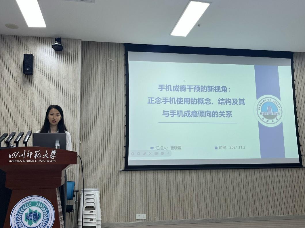 22级教育学原理(心理学方向)研究生曹晓萱(导师:连帅磊副教授)的论文摘要“手机成瘾干预的新视角:正念手机使用的概念、结构及其与手机成瘾倾向的关系”被会议收录并作会议报告。该研究通过三个子研究阐述了正念手机使用的概念、结构,正念手机使用与手机成瘾的关系和干预方案。熊猛教授肯定了该研究并指出对于正念手机使用的概念界定应当与正念结合地更加紧密。