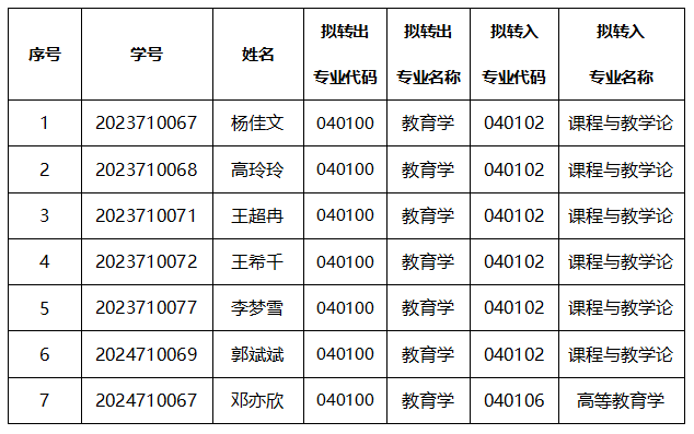 2025-2026学年第一学期一级学科内转专业名单公示