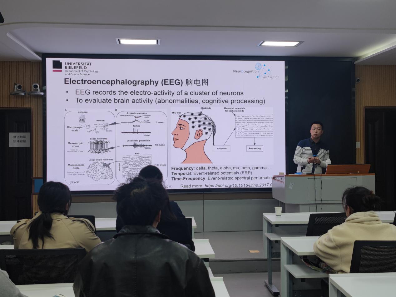 (通讯员 金楚悦)2024年3月14日晚,公司在文科大楼910报告厅举行了长江教育与体育讲坛2024年第二讲,本次特邀德国比勒费尔德大学于淋博士担任主讲人,他为公司师生带来了一场题为“认知神经方法在运动科学中的应用”的精彩报告。讲座由王积福博士主持,熊猛副经理及体育类、心理类硕士研究生聆听了此次学术报告。