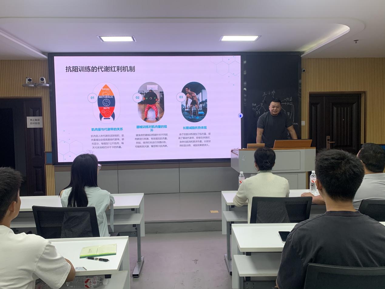 张云洁老师以体育健身为主题展开分享。张老师表示随着健康意识的提升,健身房运动已成为推动全民体育锻炼的重要方式。各地健身房通过专业设施、科学指导和多元化课程,吸引不同年龄段人群参与锻炼,助力提升国民体质。张老师向我们介绍了健身房的器械训练能针对不同的肌肉群进行刺激,有效增加肌肉量。随着“互联网+健身”模式的发展,科学锻炼将进一步普及,为健康中国注入新活力。