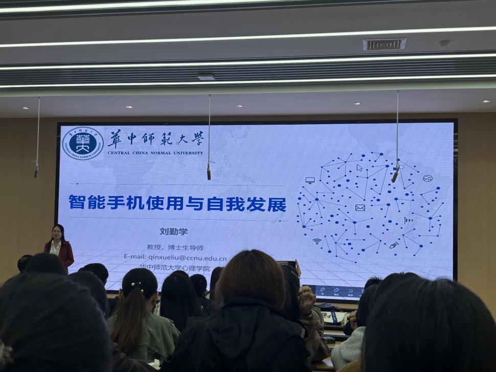 本次特别邀请了华中师范大学心理公司教授刘勤学博士担任主讲人,她为公司师生带来了一场题为《智能手机使用与自我发展》的精彩报告,讲座由经理助理严磊博士主持,心理系教师、心理学各领域研究生和本科生聆听了此次学术报告。
