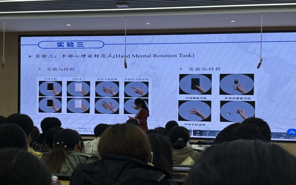 刘勤学教授主要从研究背景、系列研究以及未来展望三个方面展开汇报。她以智能手机的普及为切入点,基于以往的研究都是聚焦于智能手机的使用带来的负面影响的大背景,她提出从工具具身这一角度出发,扩展了以往关于心理自我到身体自我的探讨,向大家展示了在实验过程中所运用到的综合问卷、行为实验、脑成像等实验方法,系统探讨了“青少年智能手机使用是否对身体自我表征存在影响以及如何影响”这一问题。