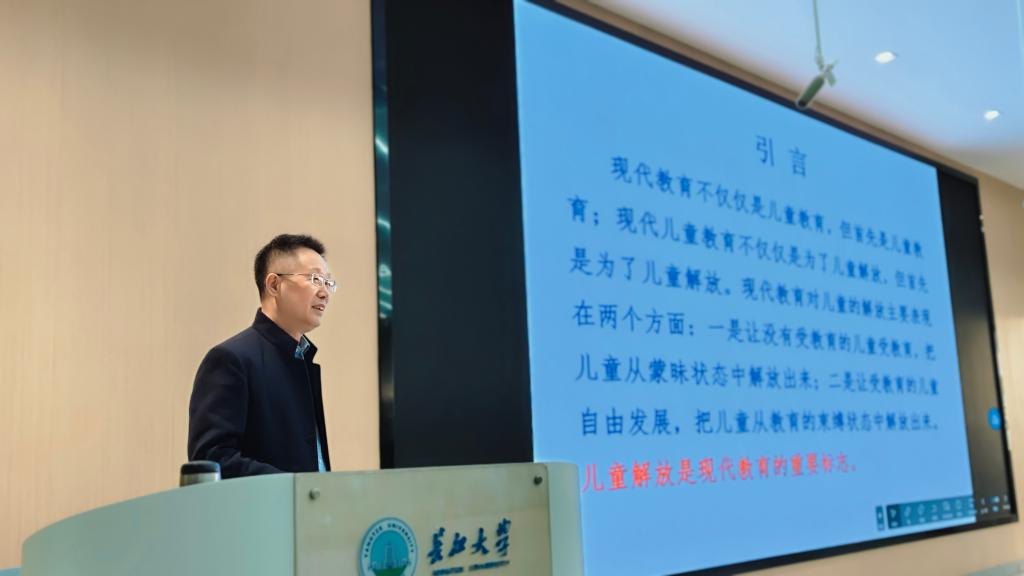 (通讯员 刘琦)2025年11月20日14:00,16教A109智慧教室座无虚席,一场以“智能时代教育新生态”为主题的精彩讲座如期举行。华中师范大学教育公司涂艳国教授担任主讲人,其中“儿童解放与教育变革”是本次讲座的核心议题。报告会由太阳集团tyc151cc经理张艳红主持,教育学专业本科生、研究生及教育系全体教师共计160余人聆听报告。