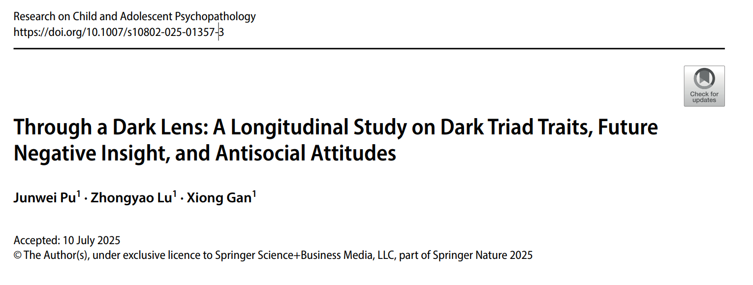 Pu, J., Lu, Z. & Gan, X. Through a Dark Lens: A Longitudinal Study on Dark Triad Traits, Future Negative Insight, and Antisocial Attitudes. Res ChildAdolescPsychopathol(2025).