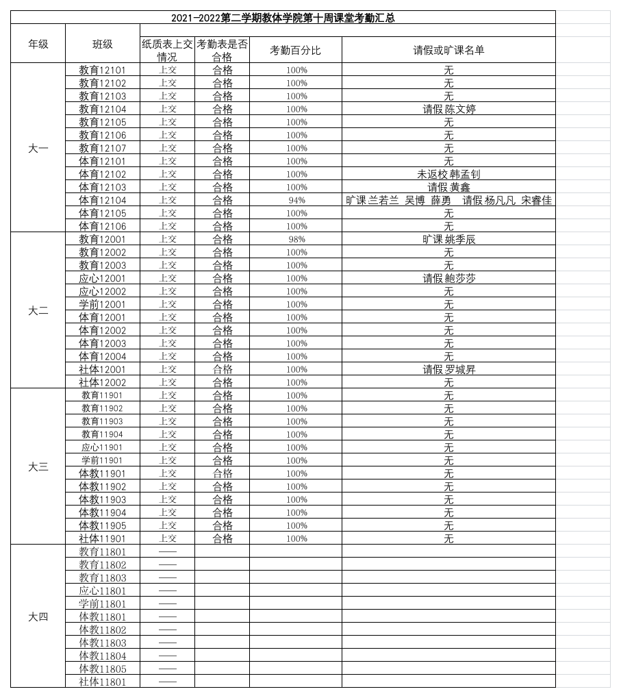 2021-2022年第二学期​公司第十周课堂考勤汇总