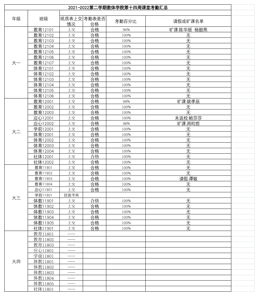 2021-2022年第二学期​公司第十四周课堂考勤汇总