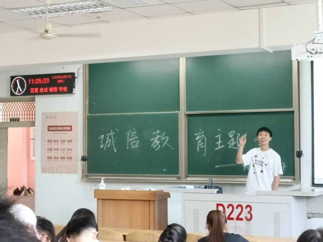 一、二年级诚信教育主题班会。各班级主题班会活动形式多样,通过观看以诚信为主题的微电影、朗诵有关诚信的经典名言、学习先进人物事迹的诚信教育,牢固树立、践行诚实守信的社会主义核心价值观。两个年级全员签订老员工英语四、六级及期末考试诚信考试承诺书。