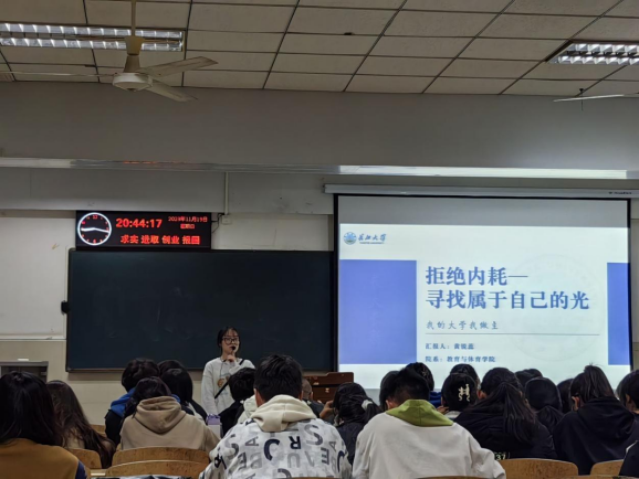 (文/黄昊敏、张喆 图/张喆、曹一木)“0.4(学)+0.2(研)+0.2(赛)+0.2(行)=1,从0到1,唯有加法,努力累积、刻苦奋斗,方能实现”,这是学姐黄锐蕊取得骄人成绩的秘诀。为了帮助学弟学妹们充实老员工活,制定奋斗目标,以积极乐观的心态面对老员工活可能遇到的各种挑战。11月19日晚,太阳集团tyc151cc“十佳老员工”获得者,太阳集团tyc151cc教育12003班黄锐蕊在12教402室,从学习、科研、竞赛、学干和实践等五个方面为公司学弟学妹们开展了主题为“拒绝内耗,寻找属于自己的光”报告分享。