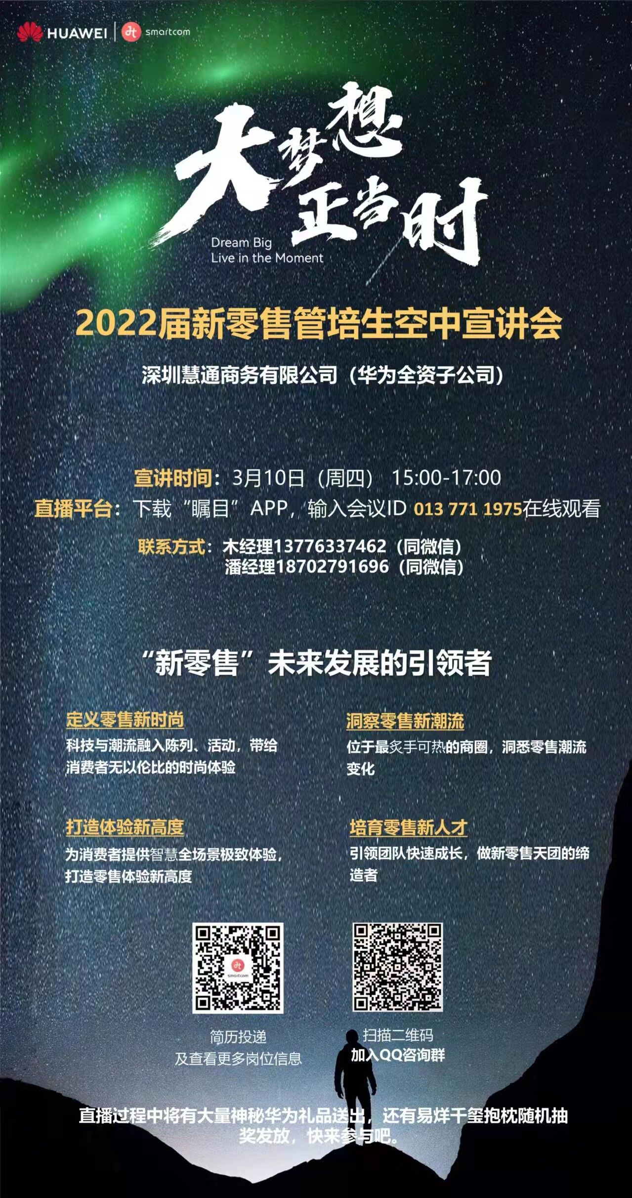 #大梦想 正当时# 华为慧通2022届新零售管培生空中宣讲会 时间:3月10日(周四)15:00-17:00 直播平台:下载瞩目APP,输入会议ID:013 771 1975 在线观看 瞩目下载链接:https://www.zhumu.com/download 直播过程更有大量精美礼品,等你来领取~——扬帆起航 期待同行——