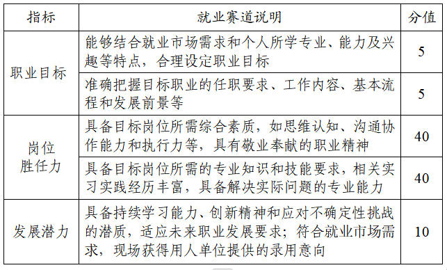 (二)就业赛道。参赛对象为普通本科三、四年级员工及全体研究生,考察其求职实战能力,个人发展路径与经济社会发展需要的适应度,就业能力与职业目标和岗位要求的契合度。