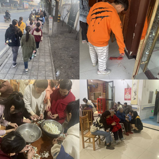 上午八点三十分,志愿者们于东校区集合完毕。随后,部长给大家讲解相关注意事项。志愿者们整装待发,头顶清晨的暖阳,带着一颗颗诚挚之心,踏上了前往敬老院的道路。上午九时许,志愿者们到达敬老院并赢得了老人们热情的欢迎。虽然一开始同学们有些紧张拘束、不知所措,但在部长的合理安排下,同学们各司其职,有条不紊地开展活动。有的帮助老人们打扫卫生,给老人们一个更干净舒适的环境;有的给老人们分发小面包,作为午饭前的小点心;有的与老人一起准备午饭食材,减轻老人们的劳动量;有的与老人们谈心,听老人们讲述过去的事情;有的为老人们表演节目,逗老人开心。在活动的最后,老人们亲切地与志愿者们合影道别。