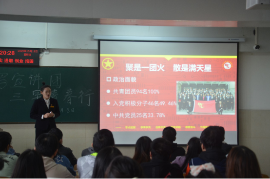 本次活动就“是什么”、“做什么”、“为什么”和“分享交流”四个部分对青马班进行了介绍。活动伊始,宣讲人白旭青对青马班的学员遴选机制、培养目标、培养机制和培养内容做出细致阐述,指出青马班旨在要建设一批“有理想”“有本领”“有担当”的时代青年。然后,宣讲人黄炼强调:青马班是一个人才济济的团体,班级成员在学干任职、学员成绩及科研水平、学员获奖等方面都处于出类拔萃的状态。“加入青马班,你就等于获得了一群益友、一个目标、一份坚定”,宣讲人在谈及个人经历时如是说道。随后,宣讲人白旭青用对比的方式讲述了青马班带给她的进步和转变,并将她自己的青马生活概括为“进步与精彩”。