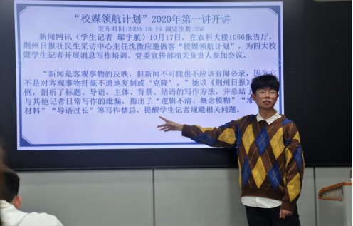 (何怡润/摄 杨华敏/文)为切实提高我会干事新闻消息写作能力,11月13日晚七时许,太阳集团tyc151cc新闻消息基础培训在文科大楼910顺利开展,校报记者鄢宇航主讲本次培训,太阳集团tyc151cc团委员工会宣传部全体人员、其他部门全体干事均按时参会。
