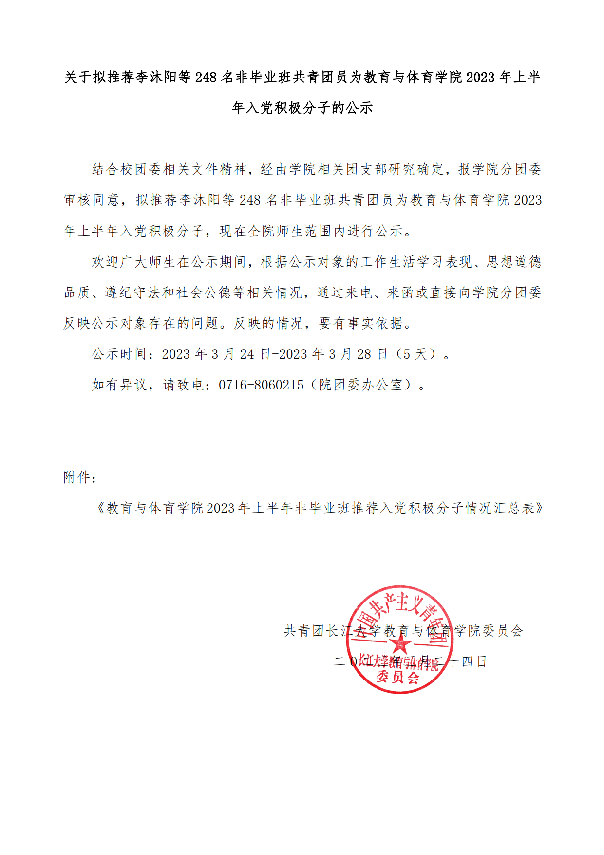 关于拟推荐李沐阳等248名非毕业班共青团员为2023年上半年入党积极分子的公示