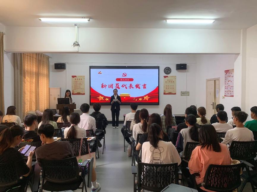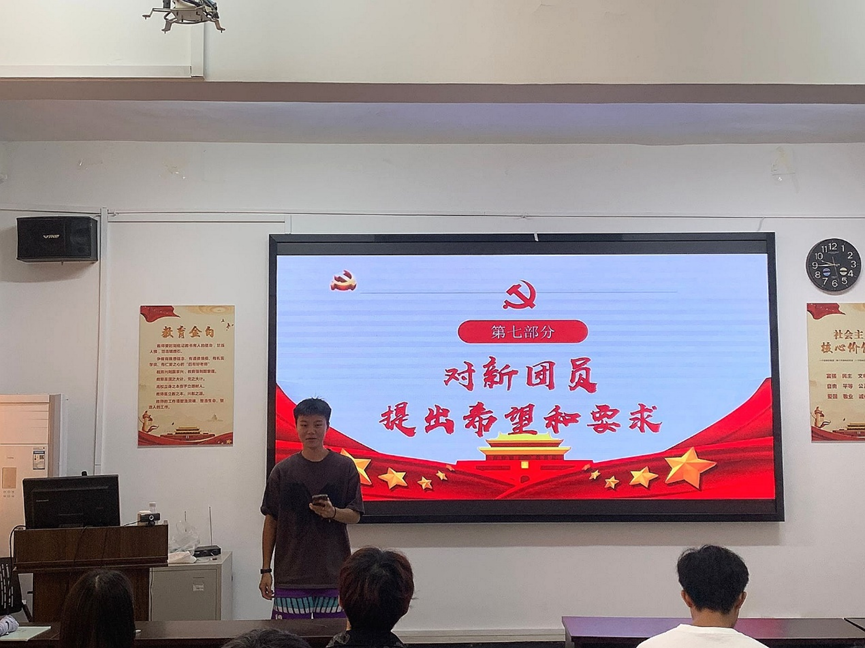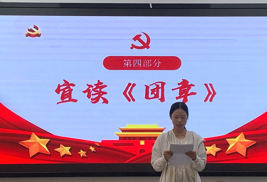 凝聚青春力量,勇担青春使命。会议伊始,全体肃立,奏唱国歌。紧接着,新团员在程璟怡同学的带领下庄严宣誓。在团旗下,新团员们郑重地举起右手,表示将坚决拥护中国共产党的领导,为共产主义事业而奋斗。